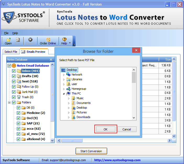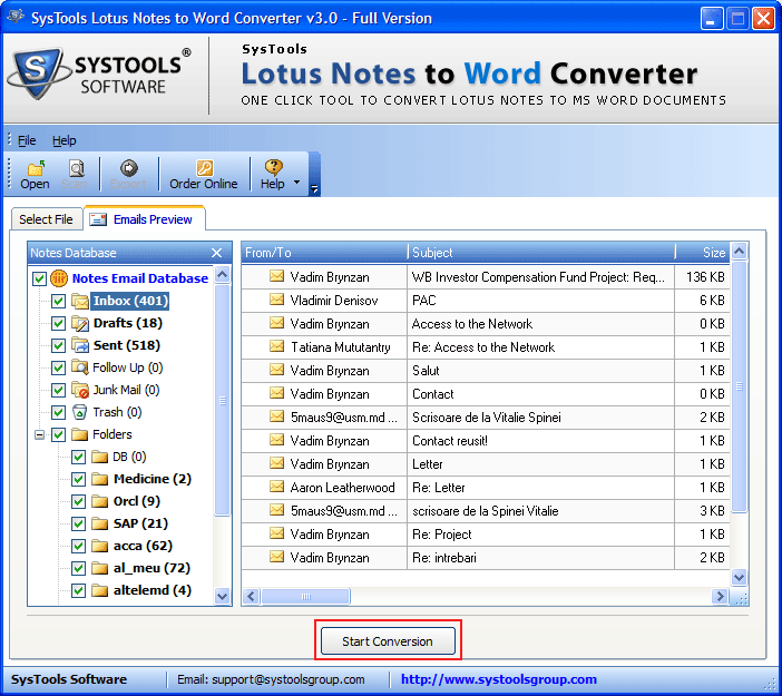 Now software will provide you the "Email Preview" of all mailboxes like Inbox, Sent items, Outbox, Draft & others. After that click on "Start Conversion" button