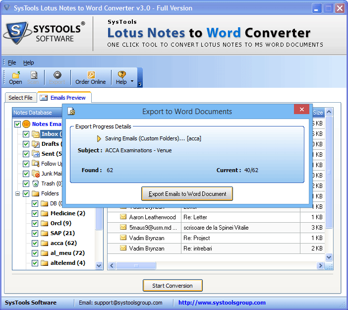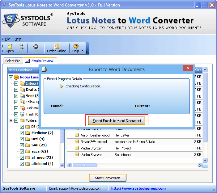 After all this a dialog box (Export to Word Document) will pop up in which you have click on "Export Emails to Word Document" to start the conversion process.